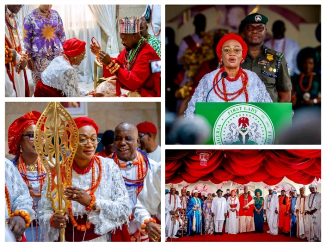The investiture, held amid pomp and cultural splendour, marked what palace sources described as an “official homecoming” for the First Lady, who traces her maternal ancestry to the Itsekiri people.